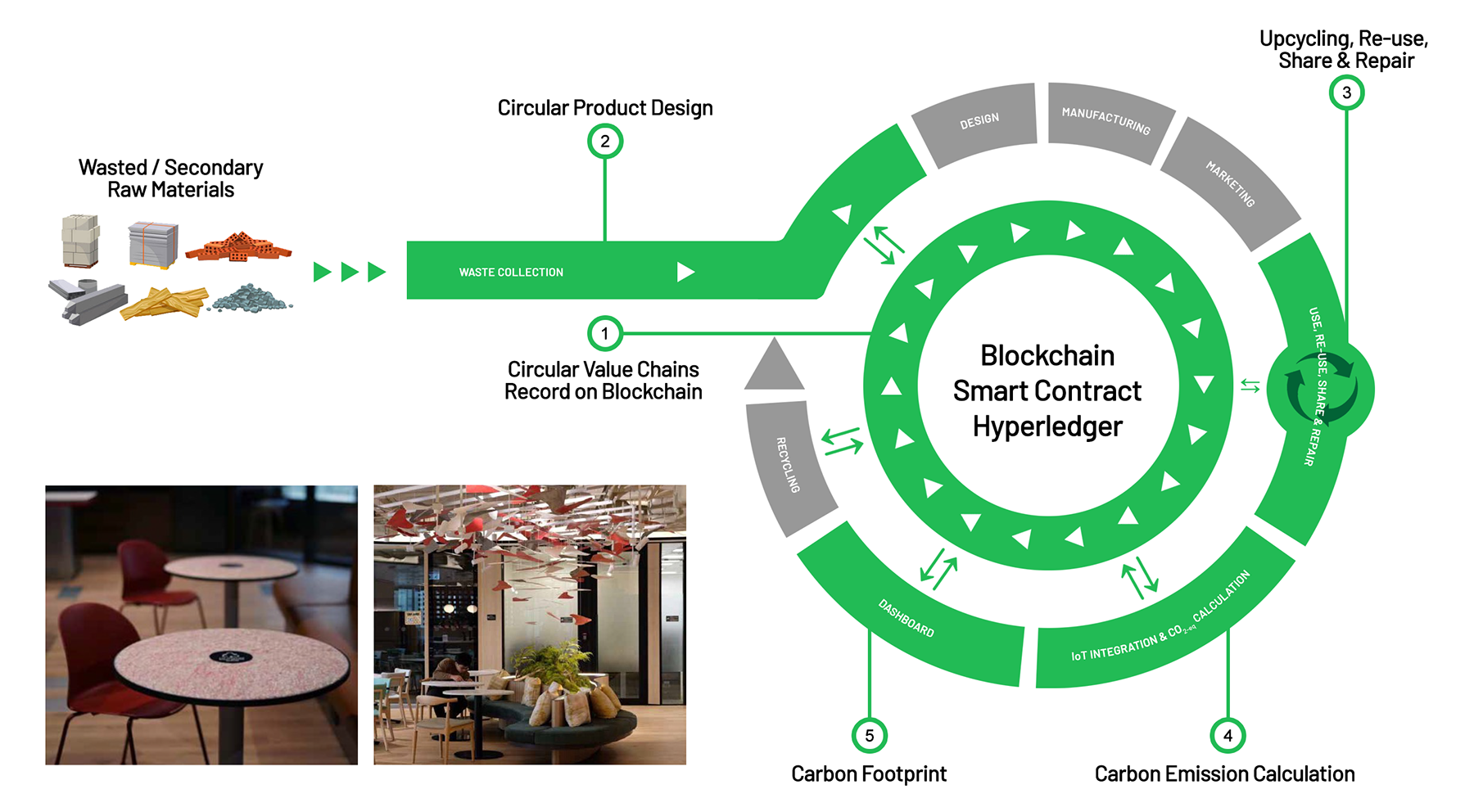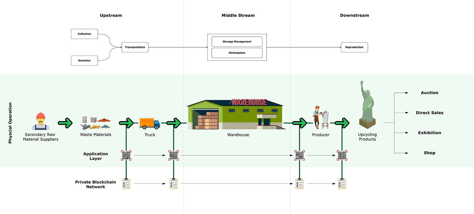 and blockchain technology, ensuring transparency, traceability, and collaboration among upcyclers, creator, and buyers for a circular economy.